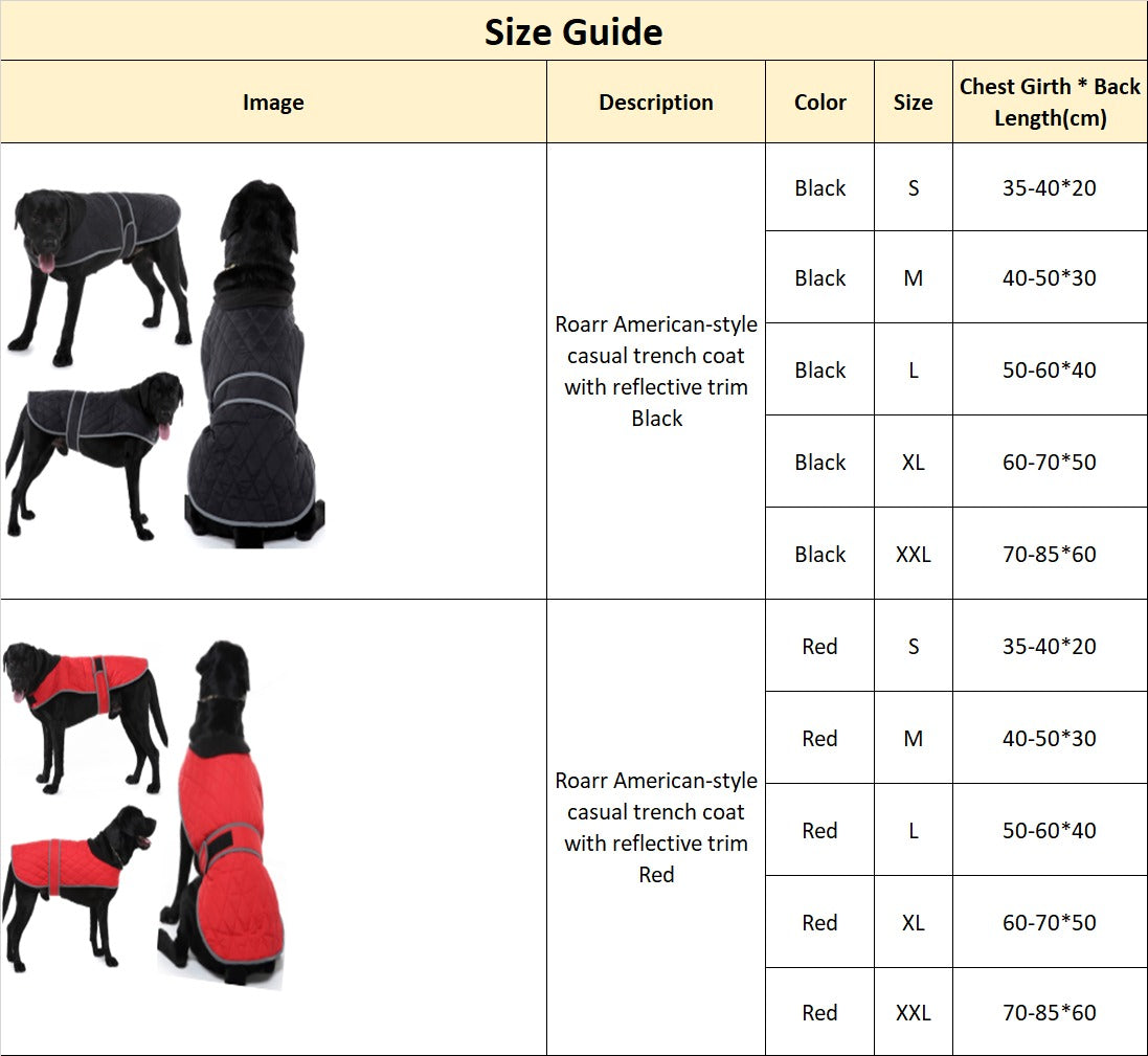 Dress your dog in timeless style with the Roarr American-Style Casual Trench Coat, a perfect blend of fashion, function, and safety. Designed with a classic quilted pattern and reflective trim detailing, this coat keeps your furry companion warm, visible, and ready for any outing ā rain or shine.